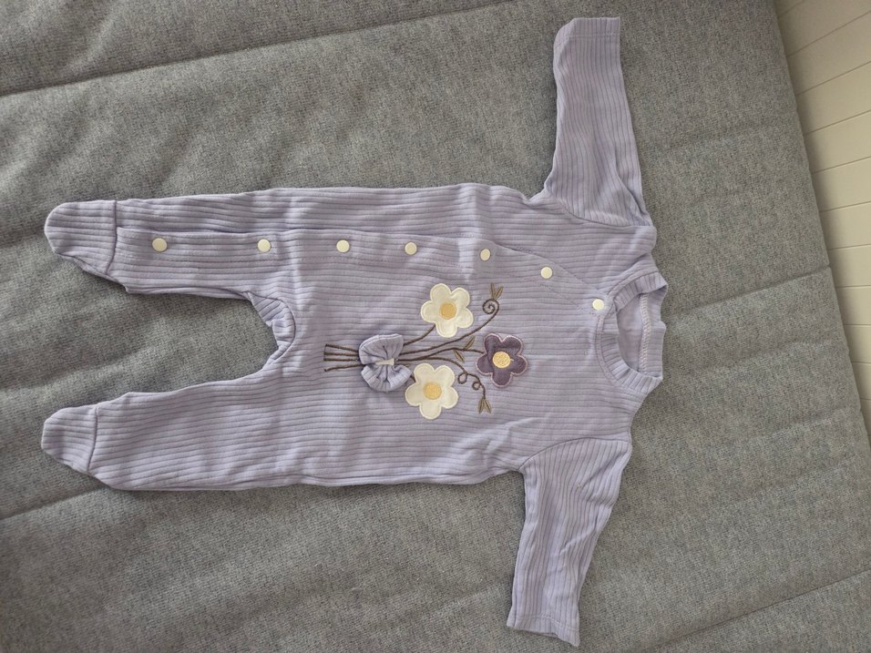 Düğmeli, nakışlı çiçek desenli gri bebek kız tulumu. Yumuşak dokulu kumaş rahatlık sağlar.