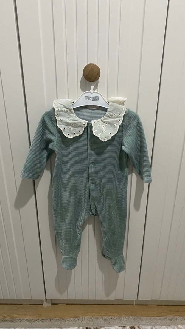 Gri renkli bebek kız tulumu, nakış detaylı ve düğmeli ön kısmı ile dekoratif yakaya sahip. Yumuşak kumaşıyla rahatlık sağlar.