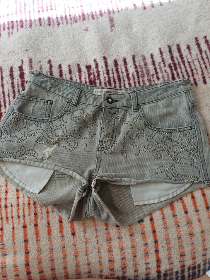 Düğmeli, nakışlı desenlere sahip bol kesim gri kot şort, bohem tarzını yansıtır. Outdoor kullanıma uygundur. pullu nakışlı zara mini şort, cok seviyorum ihtiyaçtan satıcam açıkçası.