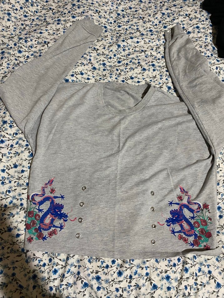 Gri renk, uzun kollu, yuvarlak yaka, düğmeli ve renkli nakış detaylı, bol kesim kadın sweatshirt. L ve M beden uyumlu
