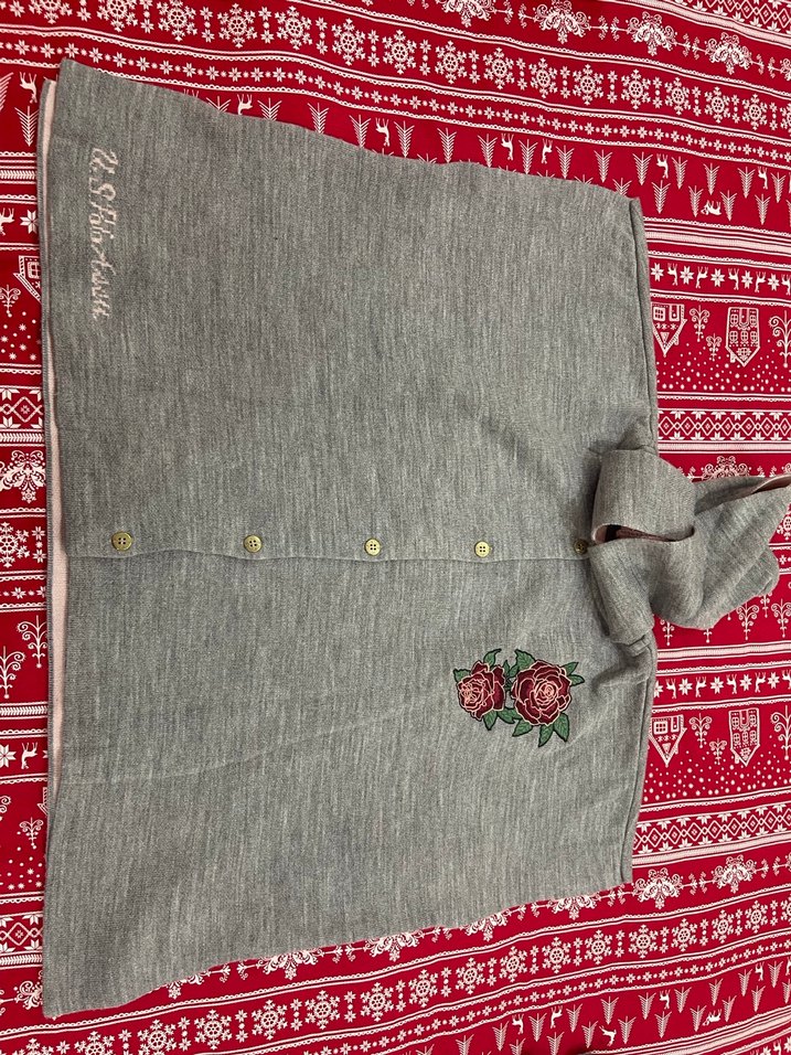 Gri renkli kız pançosu, uzun kollu ve kapüşonludur. Düğmeli kapaması ve nakışlı çiçek detayları bulunur. Bohem tarzda, bol kesimdir.