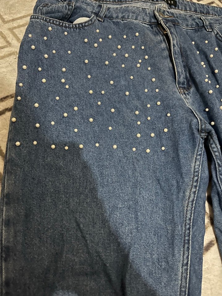 Düğmeli ve nakış detaylı, parlak mavi renkte, bol kesim kadın denim pantolon, günlük rahat kullanım için uygundur.