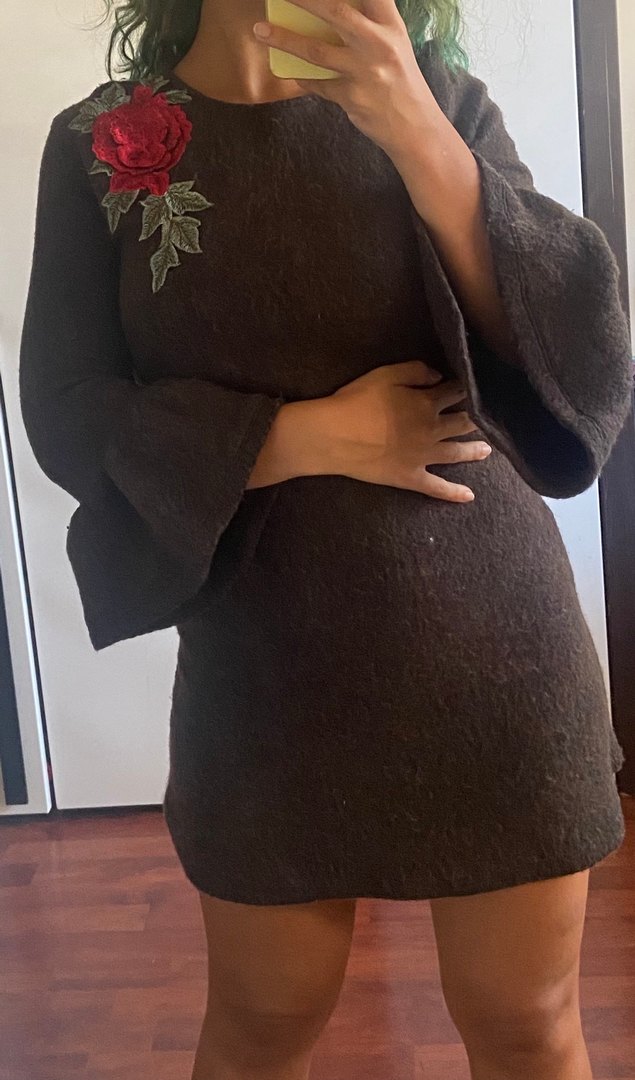 Kahverengi, yün kumaştan, düğmeli ve nakışlı, uzun kollu, bohem tarzda midi boy dar kesim elbise. Romantik akşamlar için uygundur.