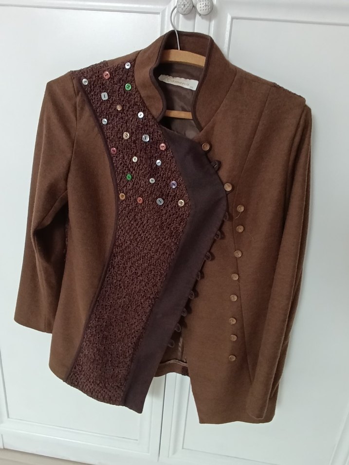 Düğmeli Nakışlı Kahverengi Kadın Midi ceket, tasarım