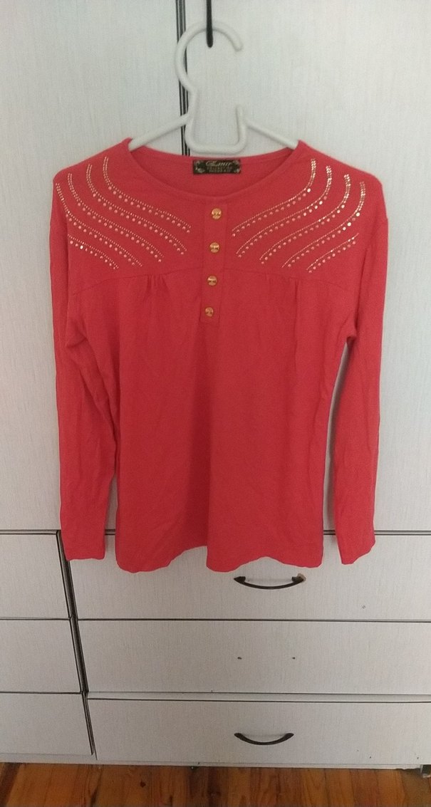 Parlak kırmızı renkte, uzun kollu, yuvarlak yakalı ve bol kesim bir bluz. Ön kısmında düğme ve nakış detayları bulunur, sentetik dokulu kumaştan yapılmıştır. Günlük rahat kullanıma uygundur.