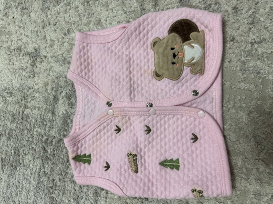 Yumuşak dokulu, düğmeli, nakışlı orman temalı figürlerle süslenmiş, pastel pembe, kolsuz ve vücuda oturan yelek. ️