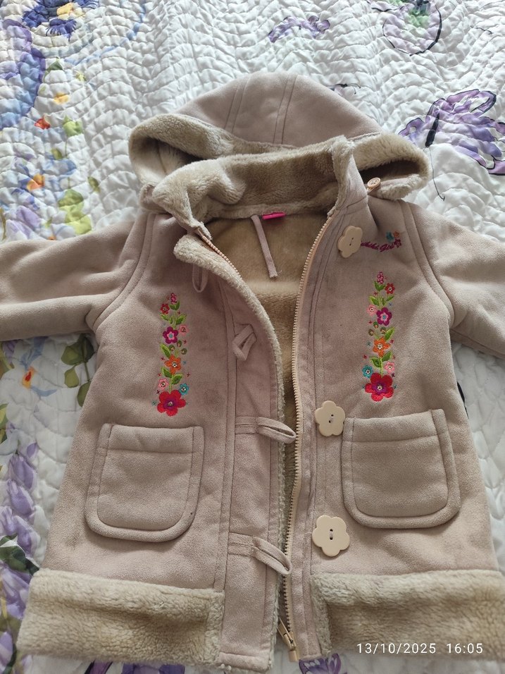 Nakışlı çiçek desenleri ve düğmeli kapaması olan, yumuşak ve sıcak iç yüzeyli kahverengi kız çocuk montudur. Trendy casual tarz için uygundur.