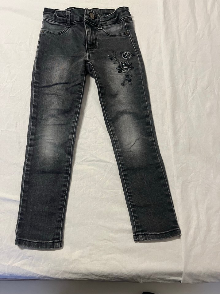 Düğmeli ve nakış detaylı, gri renkte, kız çocuklar için dar kesim kot pantolon. Street wear tarzına uygun.