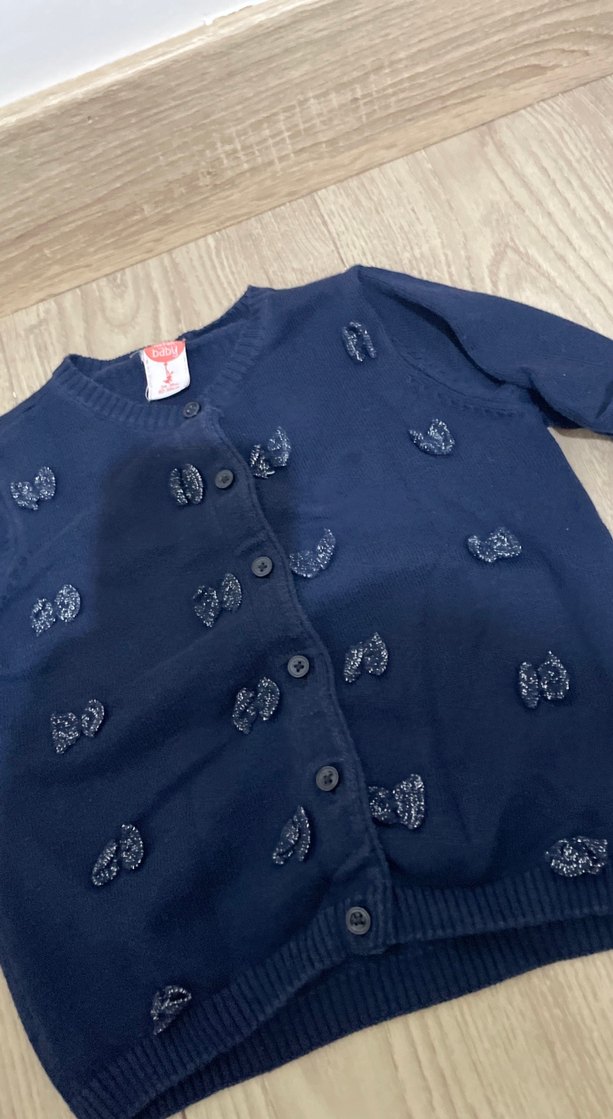 Uzun kollu, düğmeli ve bol kesim olan bu hırka, triko kumaştan üretilmiş ve mavi-gri tonlarda nakışlı desenlere sahiptir.