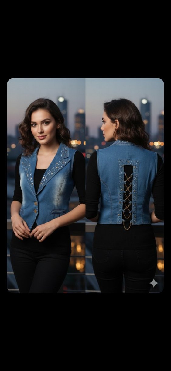 Kolsuz, düğmeli kot yelek, yakasında işlemeli detaylar ve sırtında zincir süslemeleri ile günlük sokak stiline uygun koyu mavi renkte.az kullanılmıştır hiçbir sorunu yoktur Boy 46 iki koltuk arası 45 cm VİTRİN görseli temsilidir likralıdir