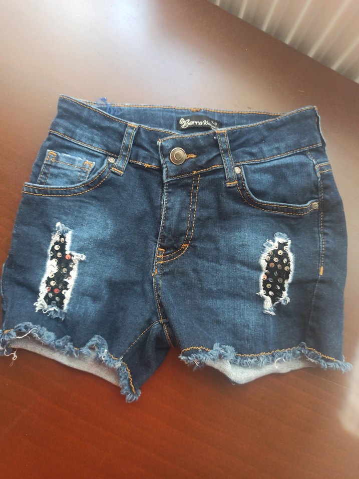 Düğmeli kapama ve ön kısmında nakış detayları bulunan, fitted kesim koyu mavi kot şort. Yıpranmış kenarları ile sokak stili tamamlanır.