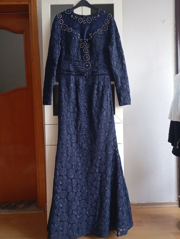 Düğmeli ve nakışlı detaylara sahip, tekne yaka ve uzun kollu, lacivert uzun elbise. Vintage ve gotik tarzda, düğün için uygun. ✨