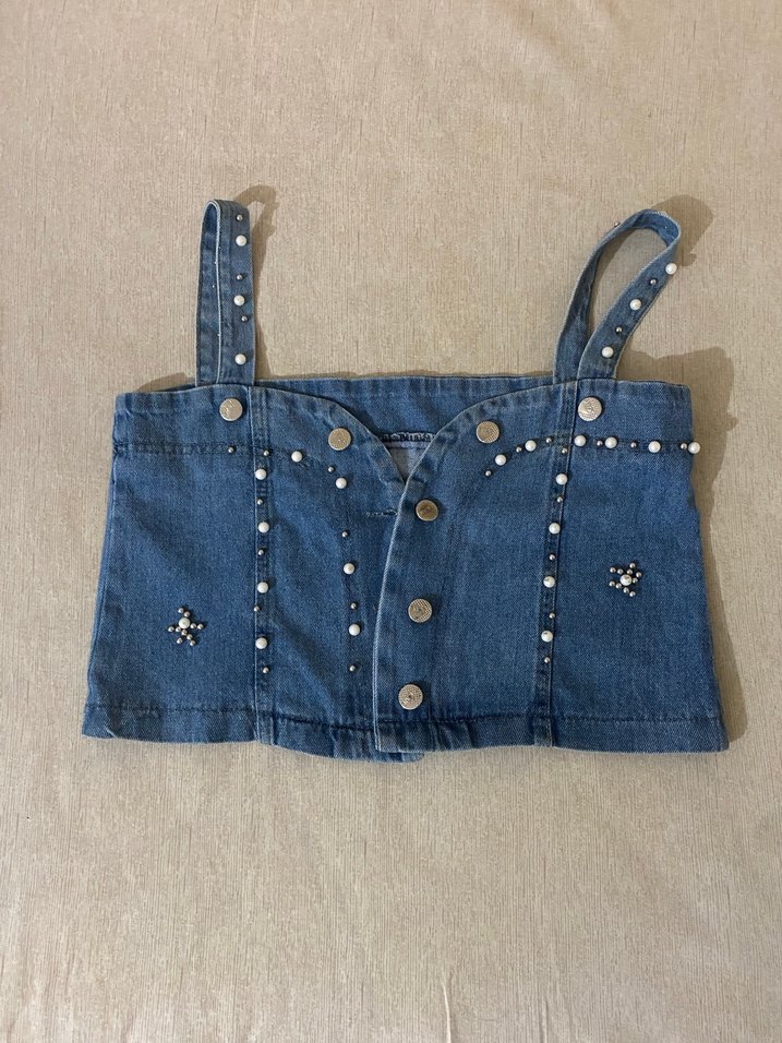 Düğmeli Nakışlı Mavi Denim Büstiyer