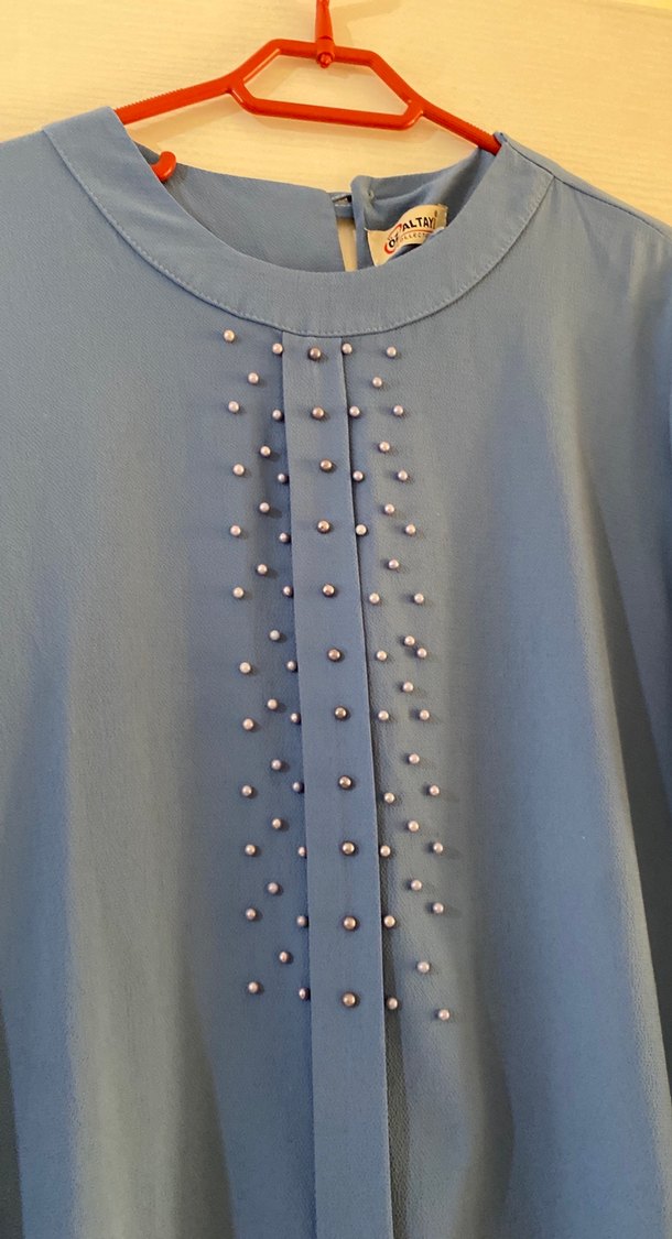 Düğmeli ve nakışlı detaylara sahip, uzun kollu, yuvarlak yakalı, bol kesim mavi hamile bluzu. Yumuşak ve ipeksi kumaştan üretilmiştir.