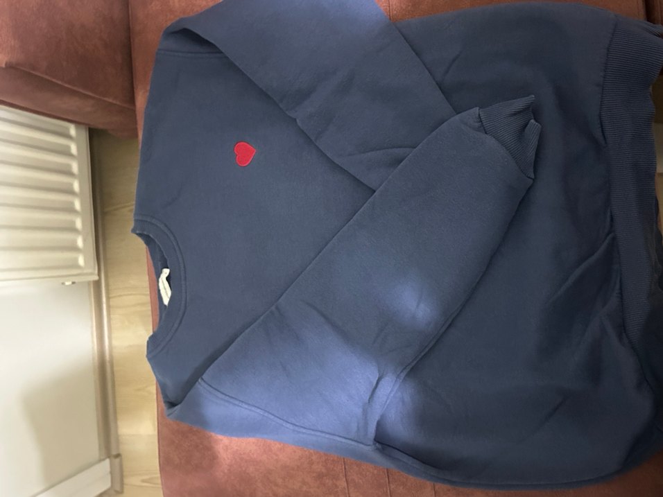 Bu rahat kesim kadın sweatshirtü, yuvarlak yakalı ve uzun kolludur. Yumuşak ve sıcak kumaştan yapılmış, önünde küçük kırmızı nakışlı kalp ve düğme detayları vardır. Koyu mavi rengi günlük sokak stiline uygundur.