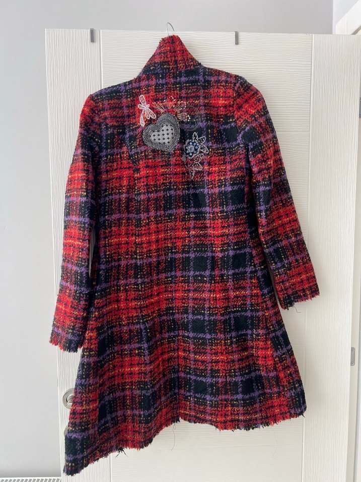 Kırmızı ve koyu ekose desenli, düğmeli, notalı yaka midi kaban. Uzun kollu, bol kesim ve nakışlı detaylarla bohem tarzı yansıtıyor. Günlük kullanıma uygun.