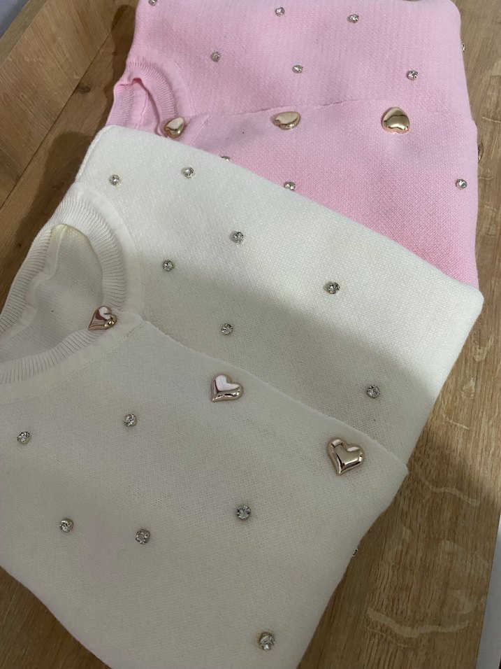 Düğmeli, nakışlı, uzun kollu mini triko kadın kazaklar, pastel pembe ve beyaz renklerde, rahat ve şık sokak stili için uygundur.