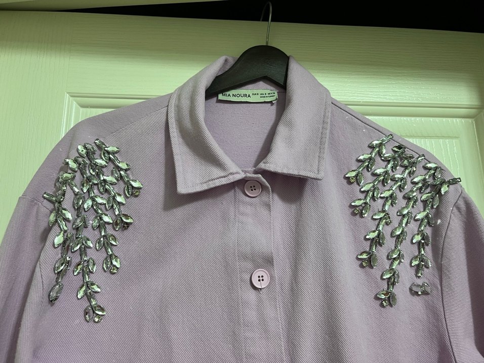 Mor renkli, düğmeli ve nakışlı kadın gömleği. Notch yaka ve uzun kollu, normal midi boyda, rahat kesim. Yumuşak sentetik kumaştan üretilmiştir. Marka: ANOURA.