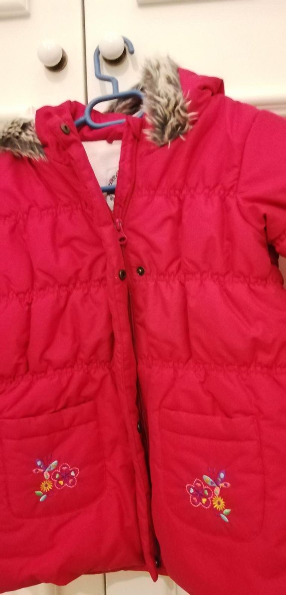 Düğmeli, yakası kesik ve nakışlı, parlak pembe renkli, yumuşak ve sıcak kumaştan yapılmış, sokak tarzı, fitted kız montu.