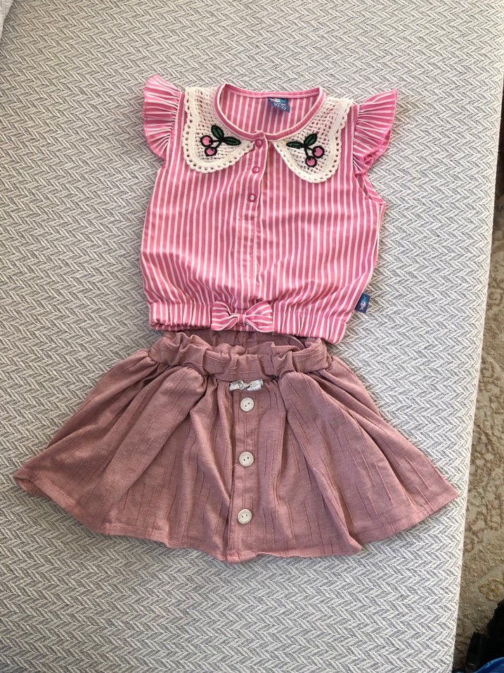 Düğmeli, kısa kollu, yakasında nakışlı pastel pembe üst ve düğmeli, belden büzgülü yumuşak pembe etekten oluşan bebek kız takımı.
