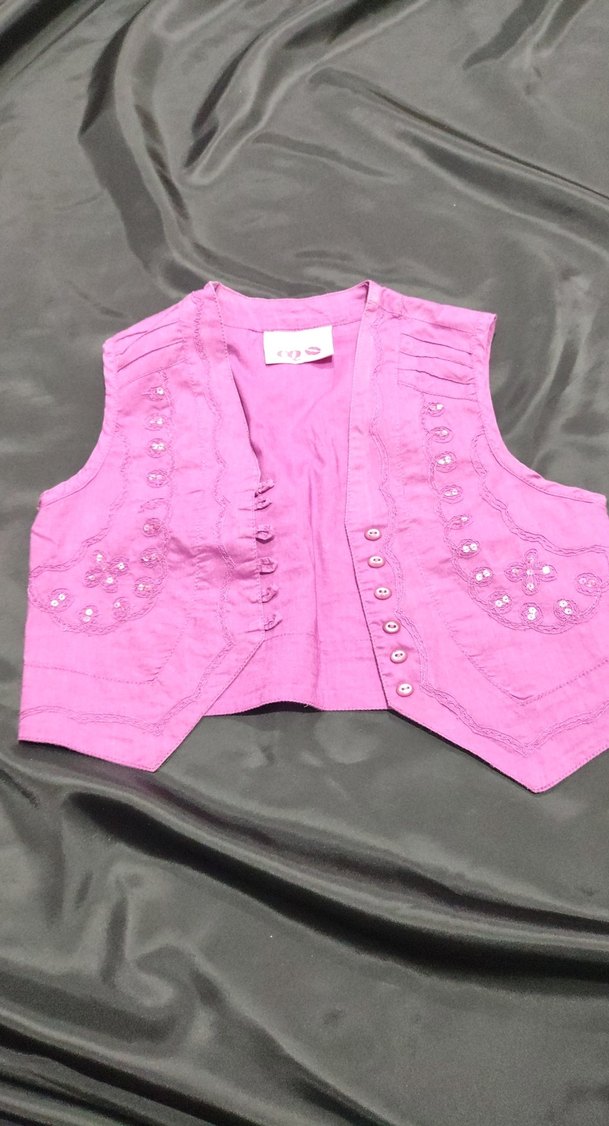 Düğmeli ve nakış detaylı, keten kumaştan yapılmış pembe, kolsuz, kesimi vücuda oturan yelek. Rahat günlük kullanım için uygun.