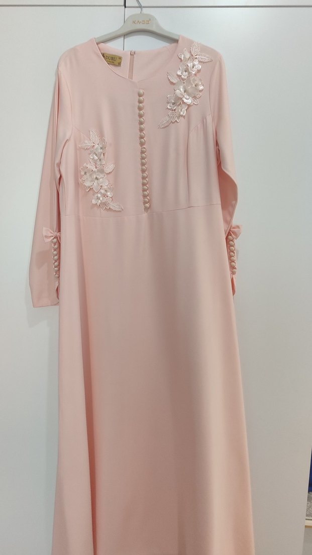 Bu pastel pembe uzun elbise, V yaka, uzun kollu ve zarif nakışlı çiçek detaylarına sahiptir. Düğmeli ön kısmı ve ipeksi kumaşıyla düğünler için uygundur.