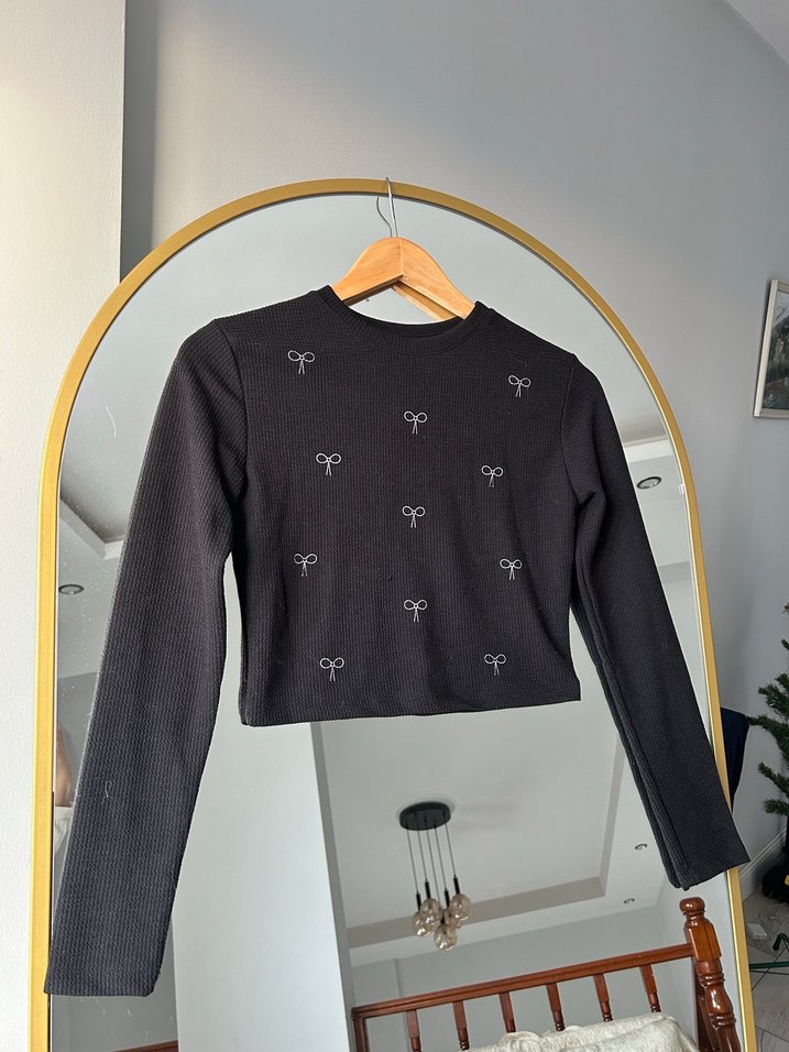 Uzun kollu, bisiklet yaka ve fitted kesim siyah crop top. Nakışlı desenler ve düğme detayları bulunur. Suni kumaştan, günlük kullanıma uygundur.