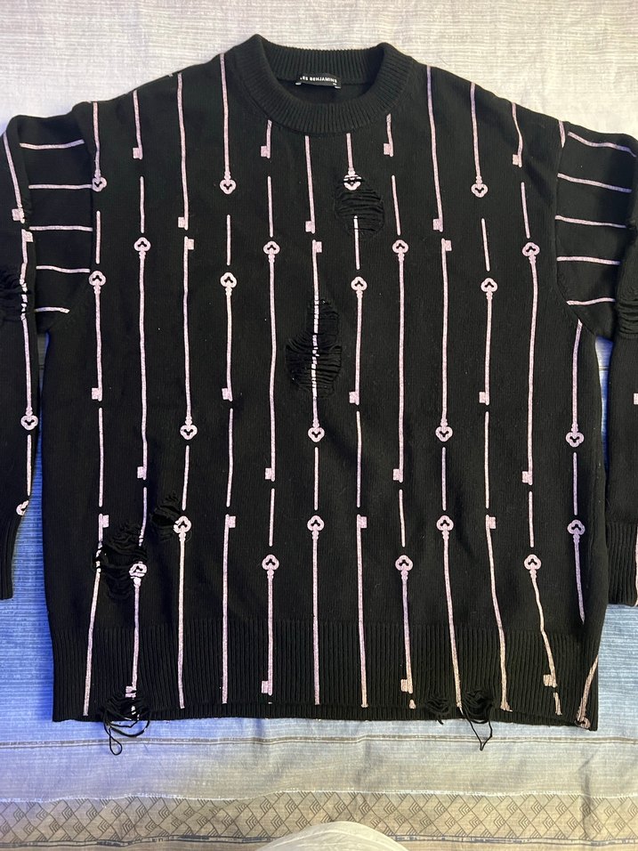 Düğmeli ve nakışlı desenlere sahip siyah erkek kazak. Bisiklet yaka, uzun kollu ve bol kesimdir, günlü sokak stiline uygundur.