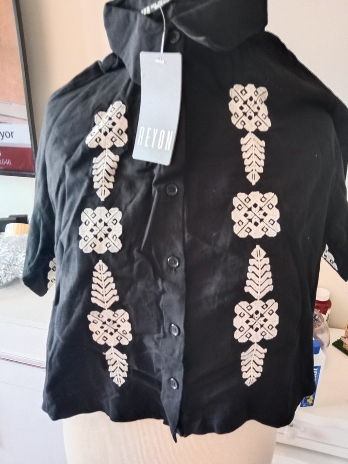 Düğmeli ön kısmı, nakışlı desenleri ve yakalı kısa kollarıyla siyah gömlek. Bol kesim ve vintage-bohem tarzını yansıtır. Günlük kullanıma uygundur.