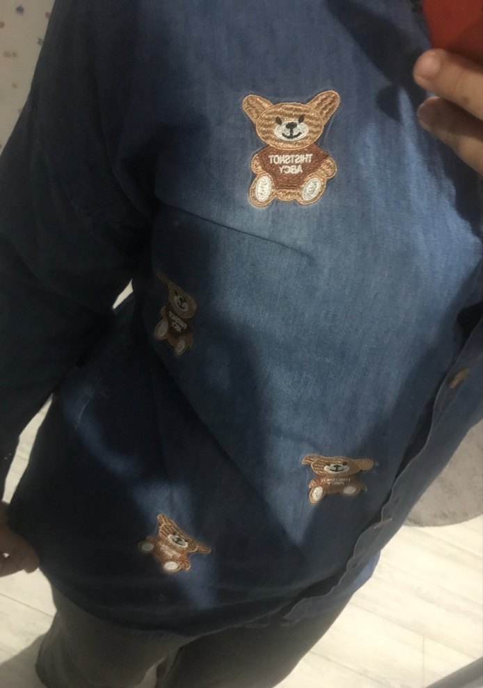 Uzun kollu, düğmeli ve yakası kesimli bu denim kadın gömlek, bol kesim ve parlak kahverengi kumaş üzerinde nakışlı ayıcık desenlerine sahiptir. Rahat günlük kullanım için uygundur.