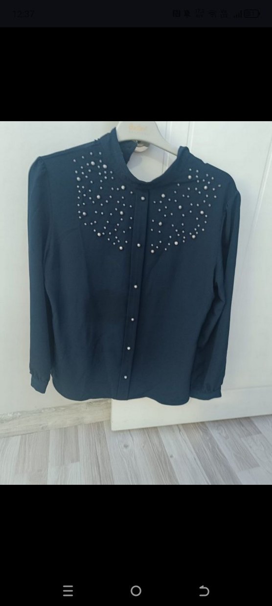 Koyu mavi, uzun kollu, yakalı ve düğmeli gömlek. Omuzlarda nakış detayları bulunur. Normal uzunlukta, rahat kesim, günlük kullanıma uygundur.
