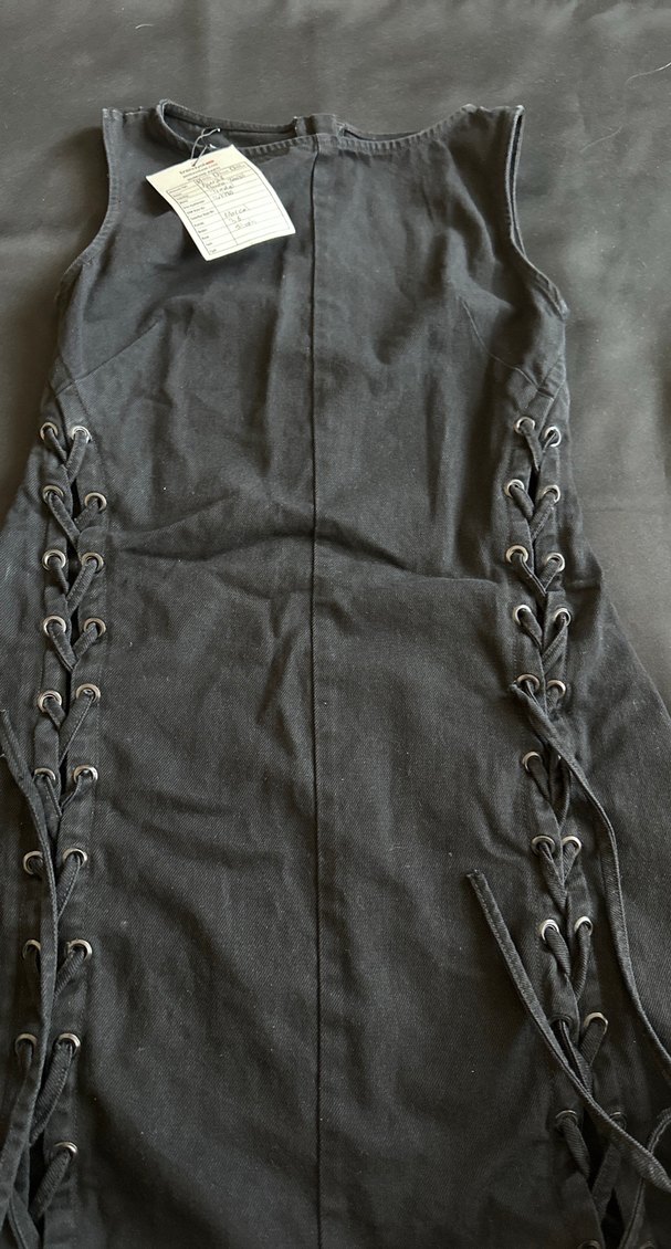 Düğmeli, nakışlı detaylara sahip, sentetik kumaştan uzun ve vücuda oturan siyah gotik tulum. Halter yaka ve askılı kollara sahiptir.