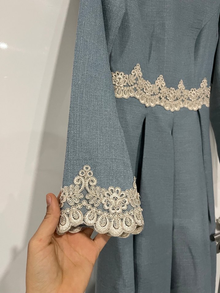Düğmeli ve nakış detaylı, klasik şıklıkta vintage tarzda uzun kollu nişan elbisesi. Gri-mavi renkte, yaka ve kol uçlarında işlemeli detaylar bulunur.