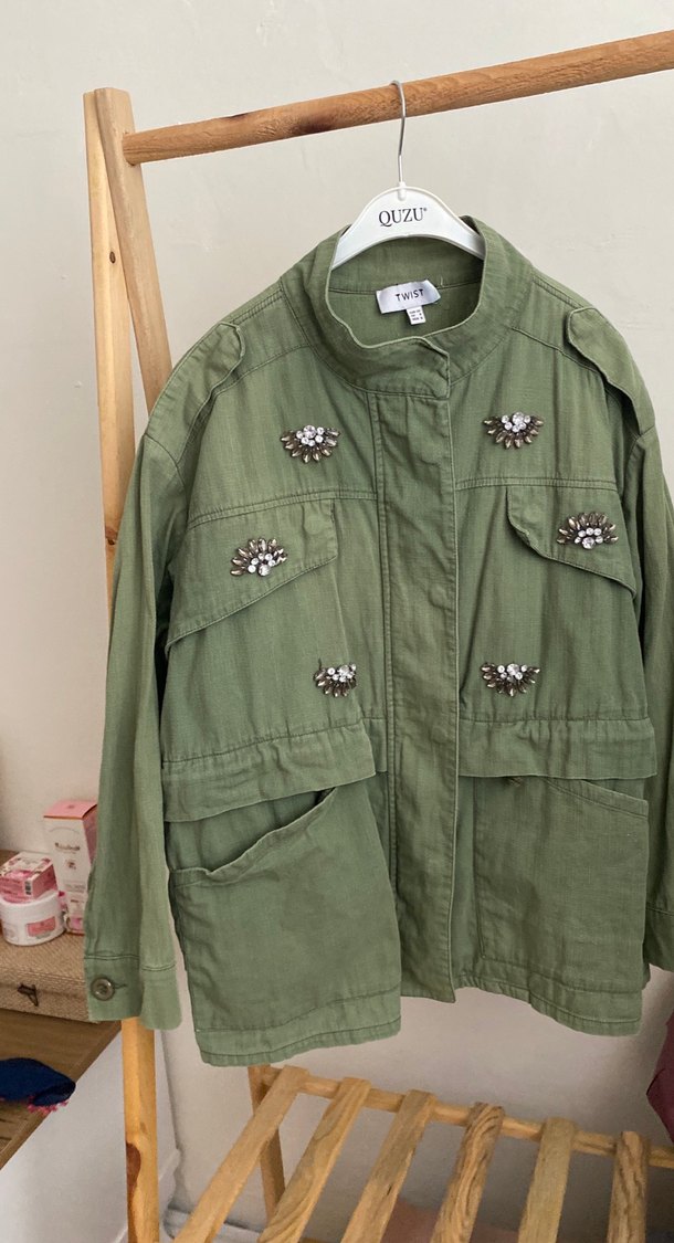Düğmeli, nakış detaylı yeşil pamuk ceket. Notch yakalı, uzun kollu, bol kesim ve midi boyda, günlük rahat sokak stili için uygun.