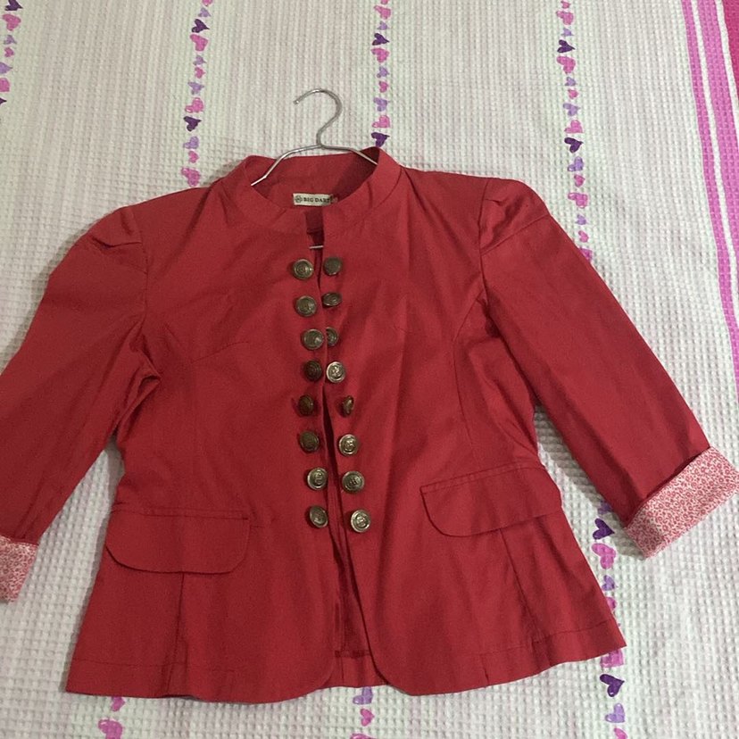 Nar çiçeği renginde, düğmeli ve uzun kollu, vintage bohem tarzda, ofis için uygun kesimi vücuda oturan kadın ceketi. Etiketli kullanılmamış yeni ürün iki koltuk arası 46 cm