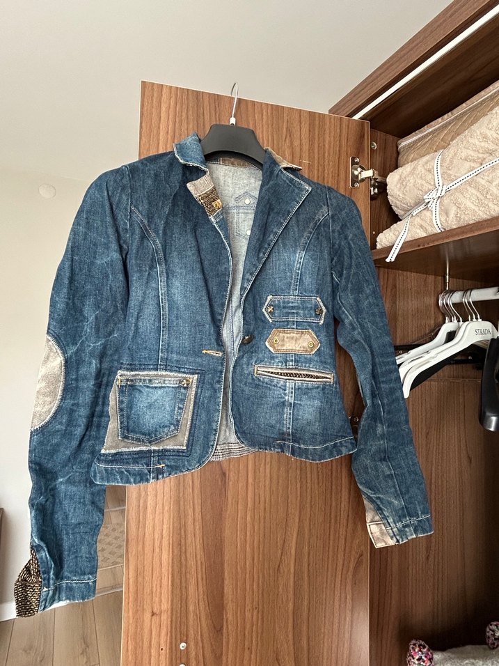 Mavi kot ceket, kesik yaka ve düğmeli ön detaylara sahip. Normal boy, regular fit ve uzun kolludur. Günlük sokak stiline uygun rahat bir parça.