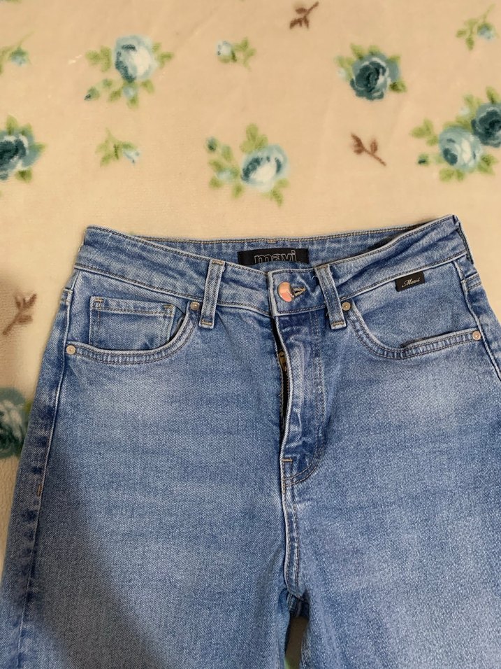 Mavi denim kumaştan yapılmış, düğmeli ve normal kesim kadın kot pantolon. Günlük rahat kullanıma uygun,