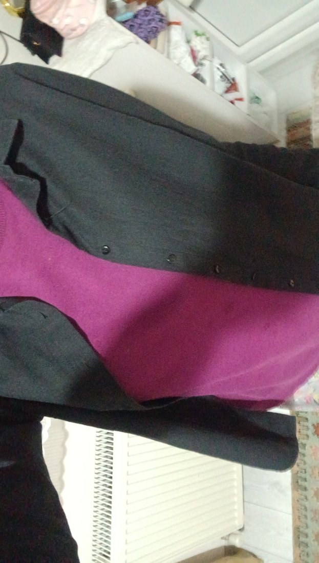 Düğmeli ön kısmı ve notch yakasıyla mor renkte, sentetik kumaştan yapılmış kadın ceket. Uzun kollu ve midi boy, günlük ve iş kullanıma uygun.