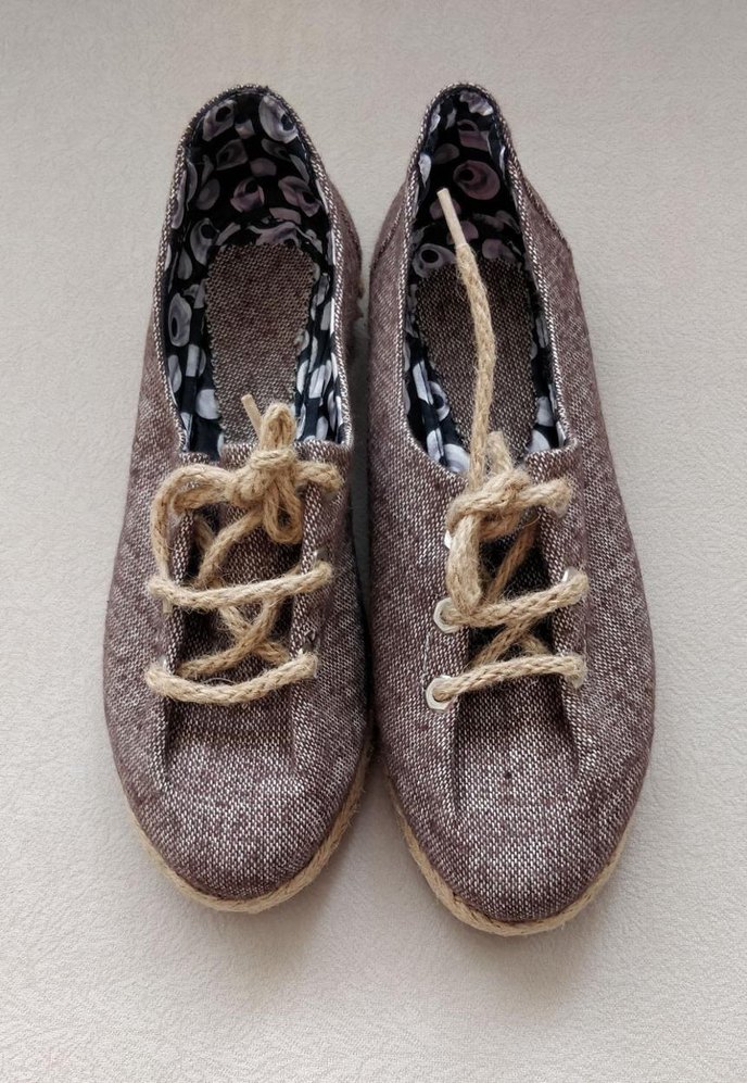 Düğmeli detaylı, örgü kumaştan kahverengi kadın espadril, dolgu topuklu ve gri desenli iç yüzeye sahip, rahat bohem tarzı.