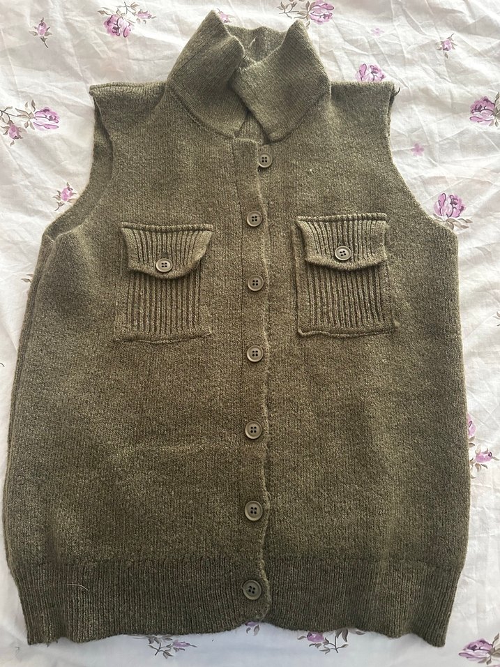 Hali yeşil, örgü kumaştan yapılmış, kolsuz ve düğmeli, yakalı, normal midi boyda, iki cepli, günlük kullanıma uygun dar kesim yelek hiç kullanılmadı Boy uzunluğu 60 cm