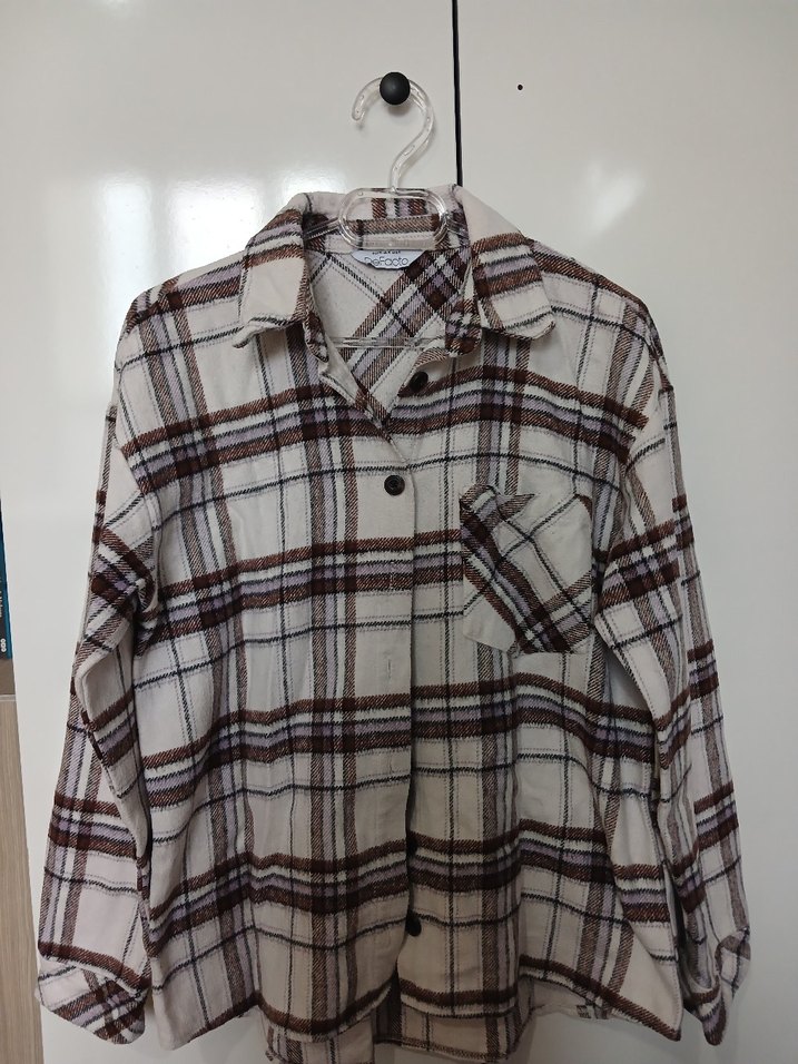 Düğmeli, uzun kollu, oversize kesim kadın gömleği. Bej ve kahverengi ekose desenli, yumuşak pamuk kumaştan, yakası notched lapel ve normal boyda, rahat günlük kullanım için uygundur.