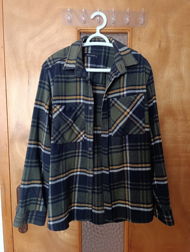 Düğmeli, oversize kesim erkek gömlek. Yumuşak yün kumaştan, uzun kollu . Koyu kahverengi kareli desene sahip, günlük kullanıma uygun rahat sokak stili.