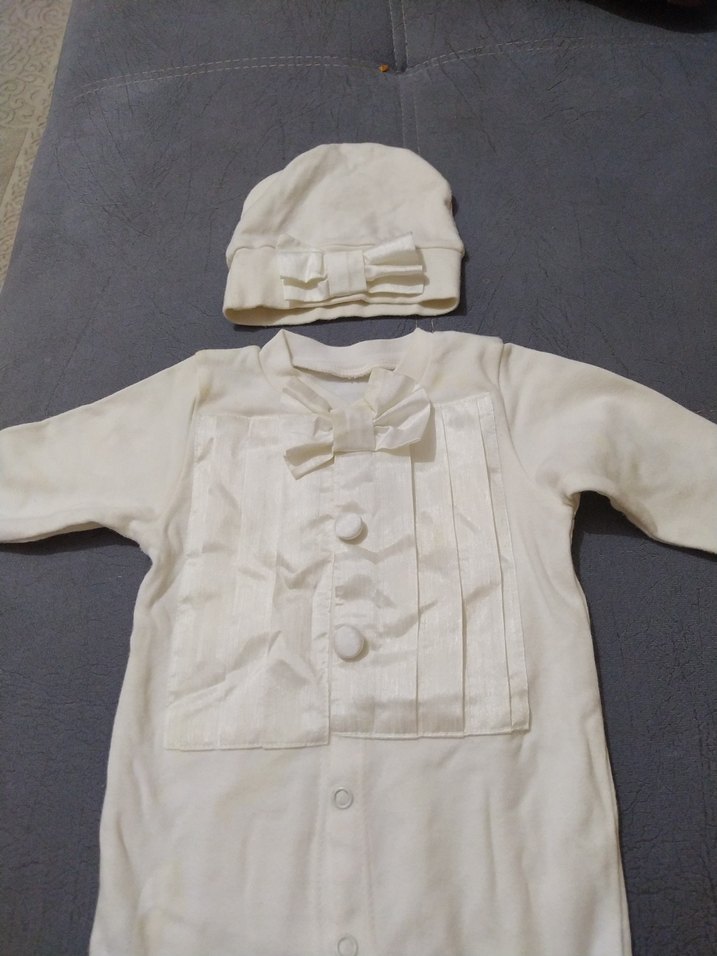 Uzun kollu, düğmeli beyaz pamuklu bebek hastane kıyafeti ve fiyonk detaylı şapka içerir. bebek mevlüt ve hastane çıkışı olarak kullanılır ben sadcee mevlutte kullandım
