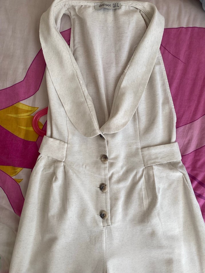 Düğmeli, pamuklu beyaz tulum.kolsuz ve notlu yakalıdır. Bol kesim ve midi boydadır, bohem ve Paris stili yansıtır. Günlük kullanım için uygundur.