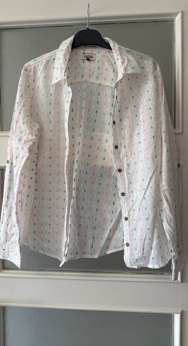 Pamuklu, uzun kollu ve düğmeli beyaz gömlek. Pastel detaylarıyla bol kesim, bohem tarzına uygun.