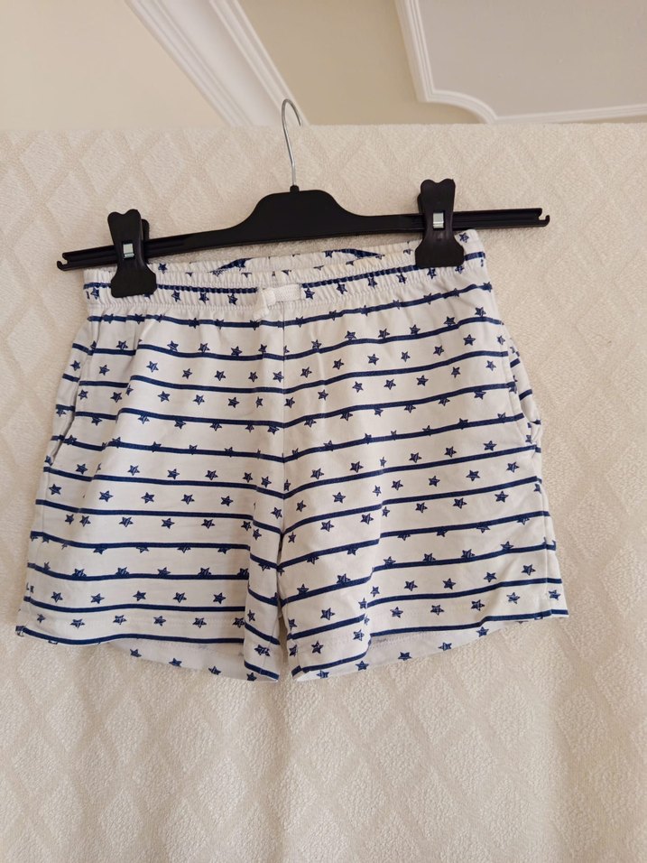 Pamuklu, düğmeli, kısa ve bol kesim kadın şort. Çizgili ve küçük yıldız desenli, plaj ve günlük sokak stili için uygun.