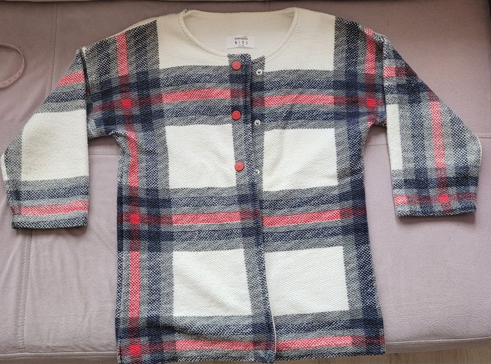 Dirsek kollu, yuvarlak yakalı ve bol kesim pamuklu kız çocuk paltosu. Düğmeli ve gri, beyaz, kırmızı çizgili desenli midi boy, rahat ve şık.