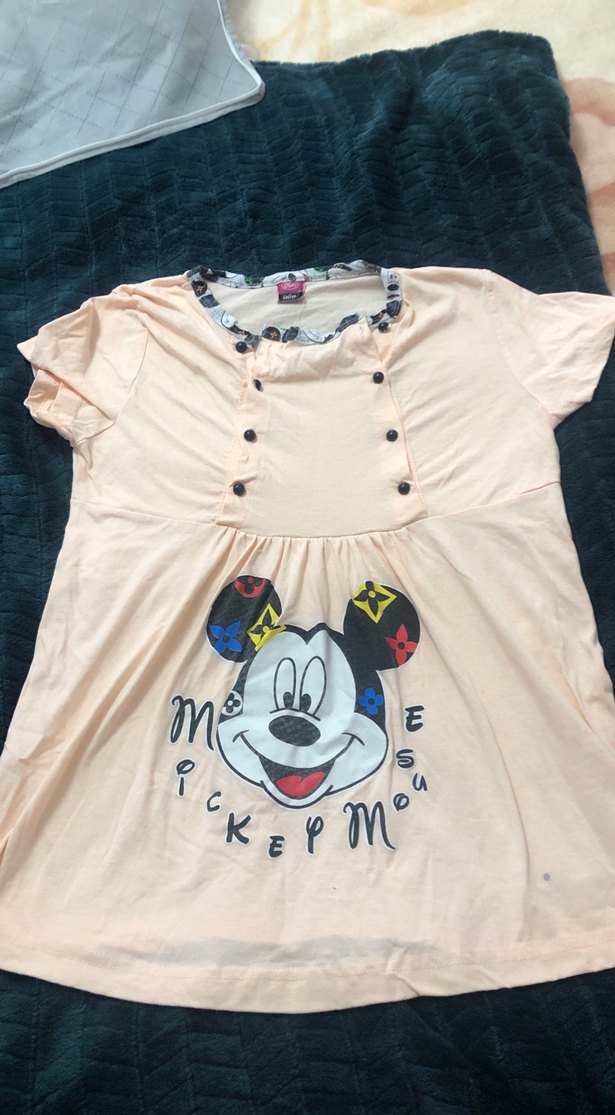 Düğmeli ön detaylı, kısa kollu, pamuklu ve bol kesim pembe hamile tişörtü. Üzerinde Mickey Mouse baskısı bulunur, için sabahlığı mevcuttur