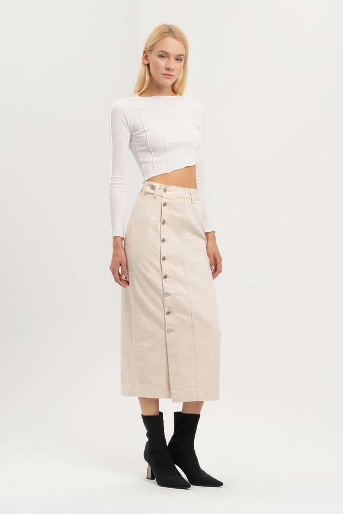 Düğmeli ön kısmı ve pamuklu yumuşak kumaşıyla uzun beyaz etek. Rahat kesimi, gündelik ve sokak stiline uygun.