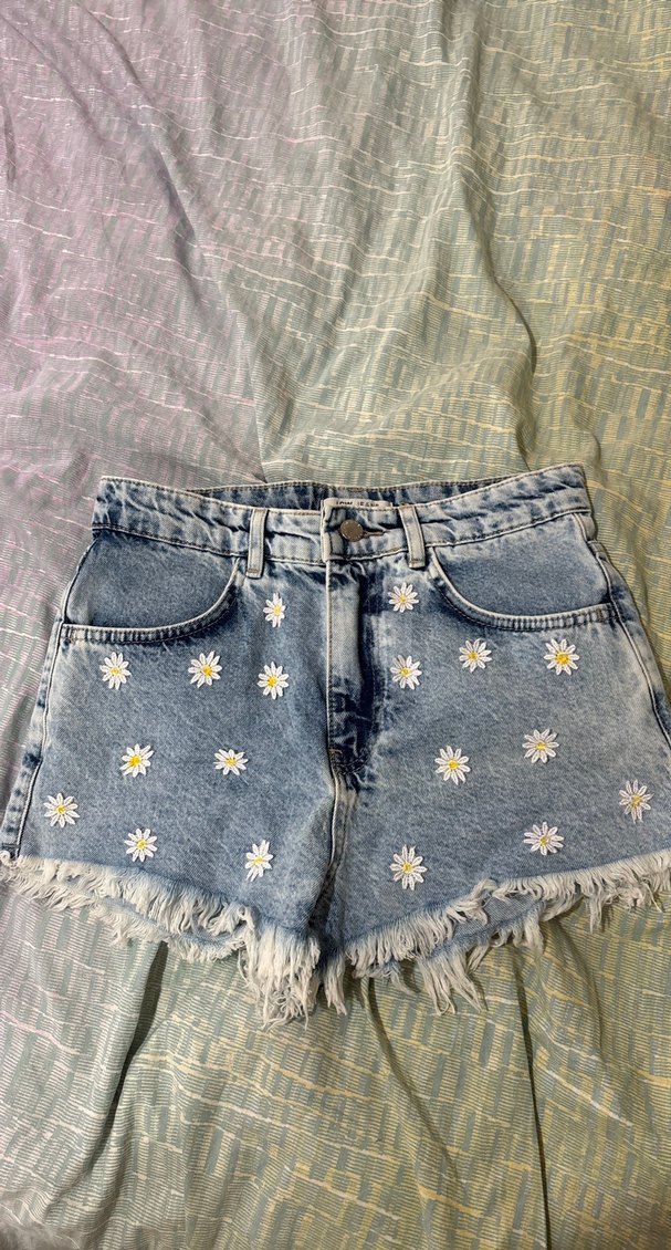 Düğmeli, bol kesim, mavi denim mini şort. Papatya işlemeleri ve püsküllü etek ucu detayları bulunur. Günlük kullanım için uygundur.